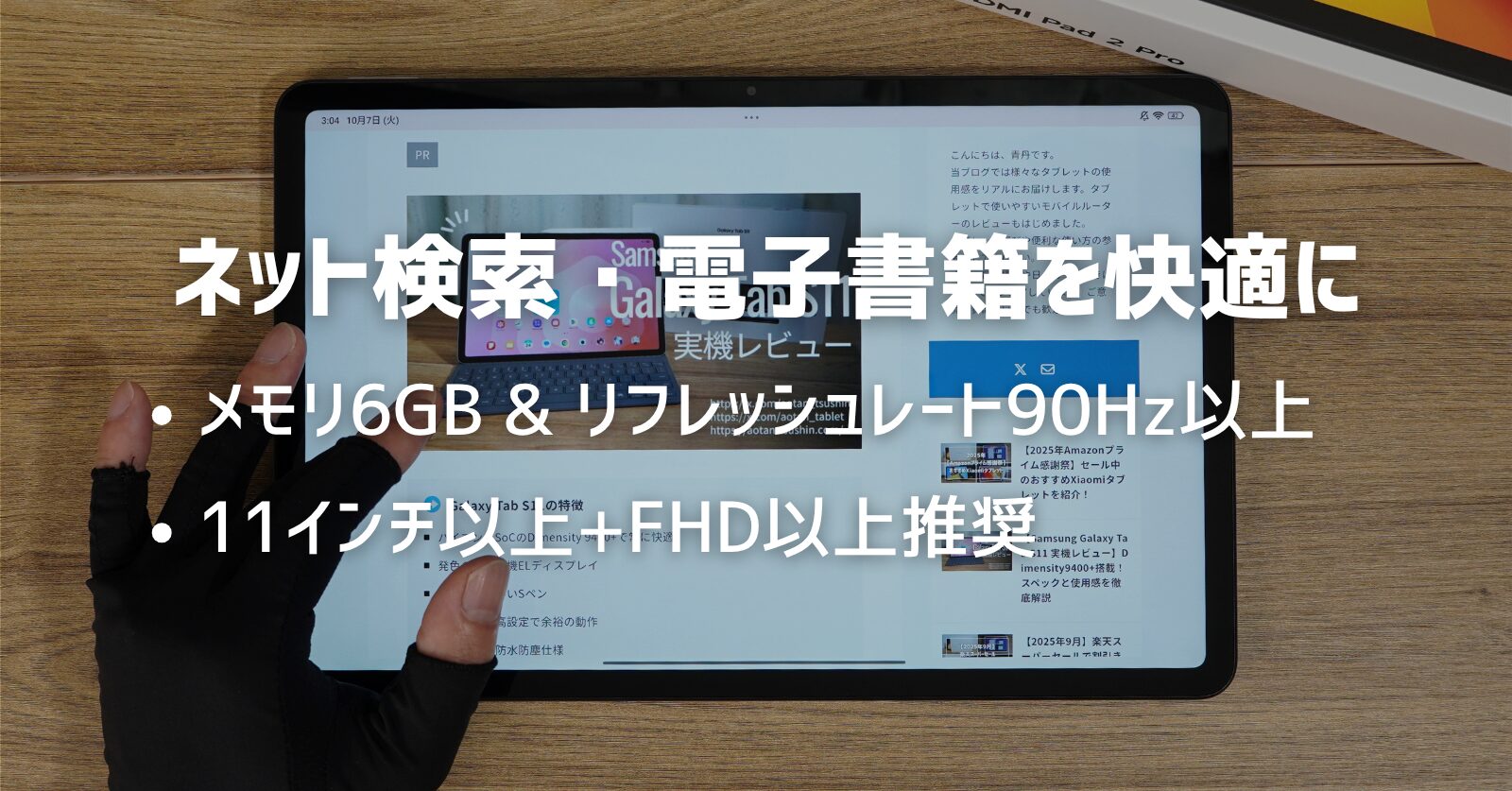 ブラウジングや電子書籍などの日常用途では、「動作の軽快さ」と「文字の読みやすさ」がポイントです 。