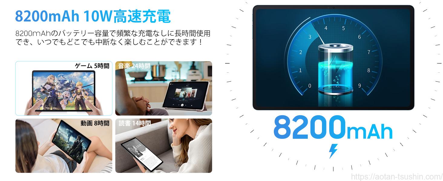 Blackview Tab90WiFiは、8200mAhの大容量バッテリーを搭載し、長時間使用してもバッテリー切れの心配はありません。