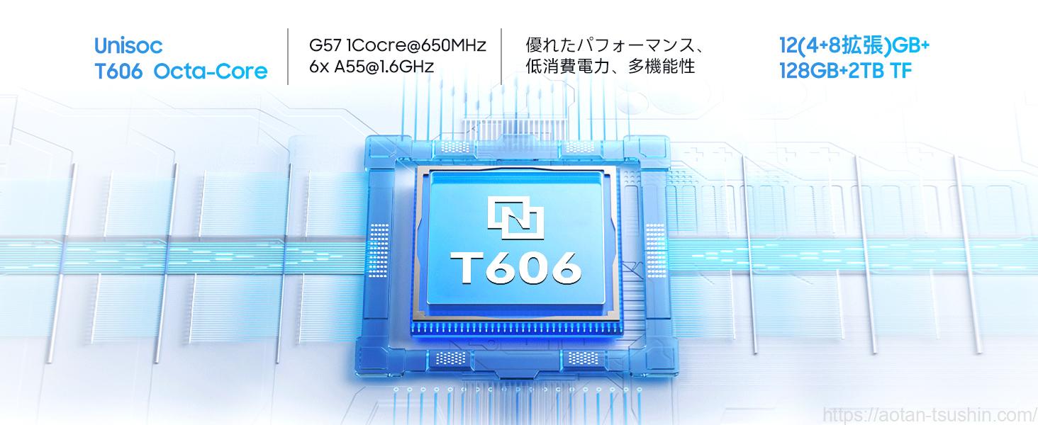 T606は、エントリーモデル向けのプロセッサで、2つの高性能A75コアと6つの省電力A55コアを備えています。
