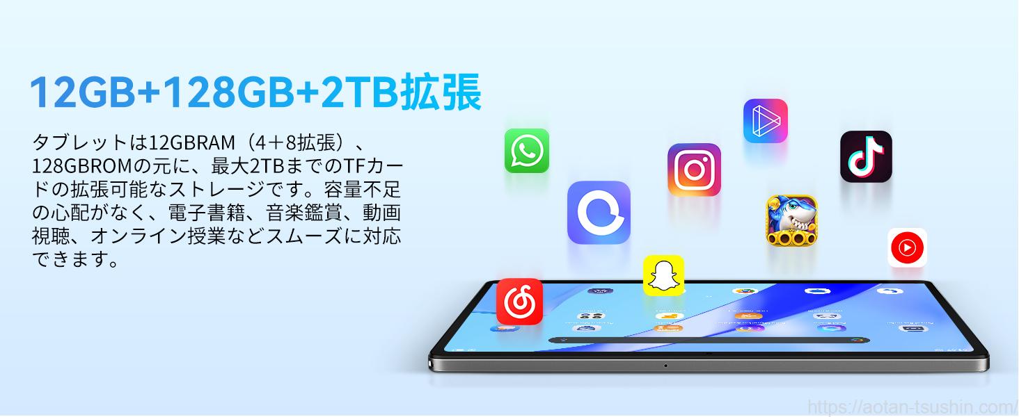 Tab90WiFiは、12GBのRAM(4+8拡張)と128GBのストレージを備えており、最大2TBまでのTFカード(SDカード)拡張が可能です。
