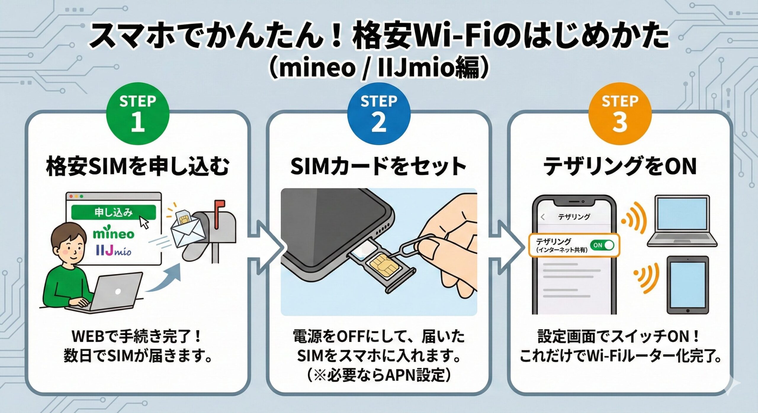 しかし、引き出しに眠っている「使っていないスマホ」を使えば、端末代はタダになります。バッテリーが多少劣化していても、ルーターとしてカバンに入れておくだけなら十分実用範囲内です。新たに高価な専用端末を買う必要はありません。
