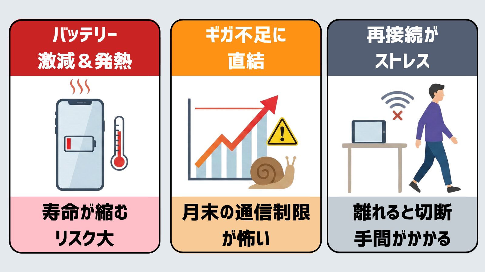 タブレットを使うたびに、メインのスマホでテザリングをONにする。手軽に感じますが、常時利用することを推奨しないのは、3つの問題があるからです。以下で詳しく解説していきます。
