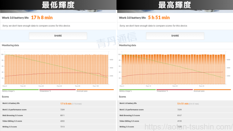 | バッテリー性能 | 最低輝度 17時間08分 最高輝度 5時間51分 |