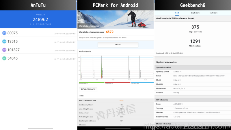 | ODEA A10 (Unisoc T606) | 248,962 (V10.2.7) | 6,572 | シングル 375 マルチ 1,291 |