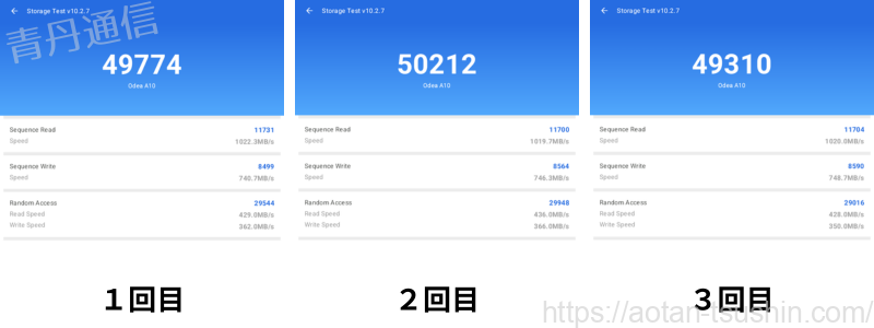 | AnTuTuストレージテスト | 1回目 49,774 2回目 50,212 2回目 49,310 |