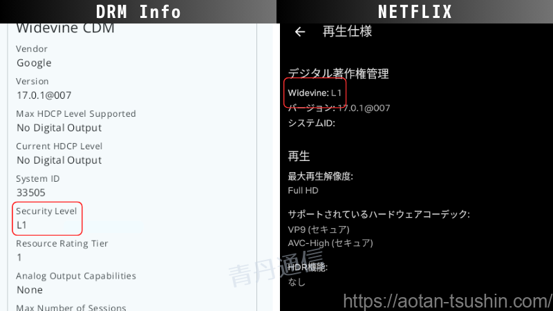 ここではWidevineをDRM InfoというアプリとNetflixの再生仕様画面で確認していきます。