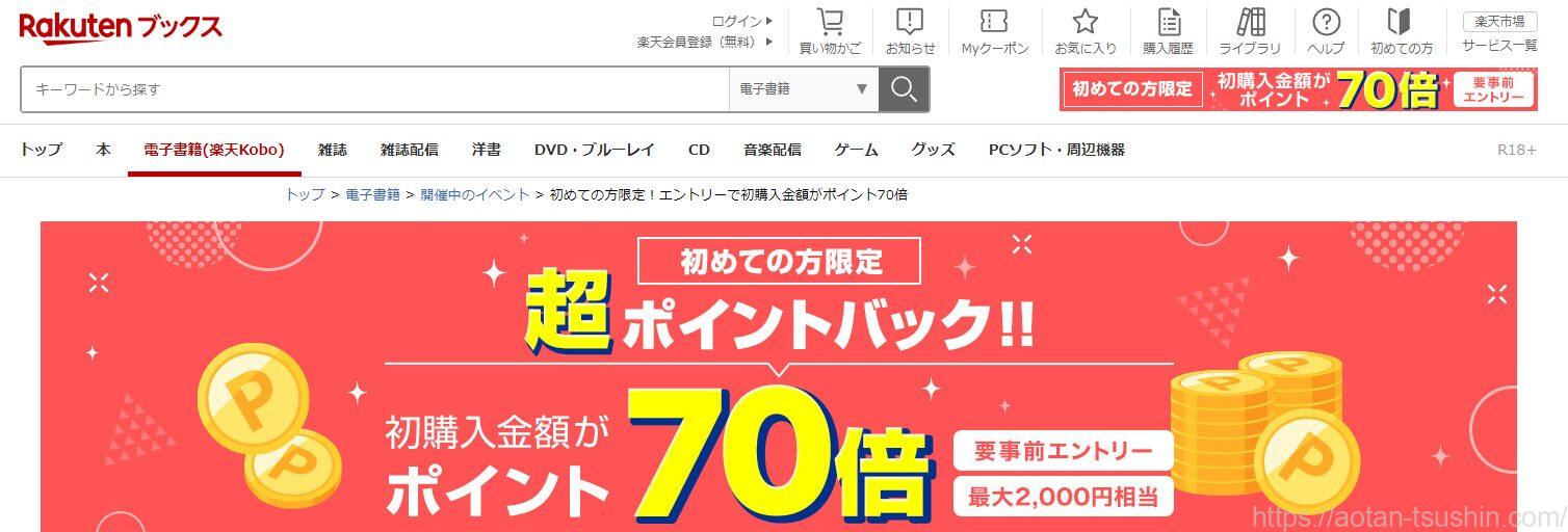 楽天KOBOなら初購入金額がポイント70倍キャンペーンを実施しているので、お得に始めることができます。