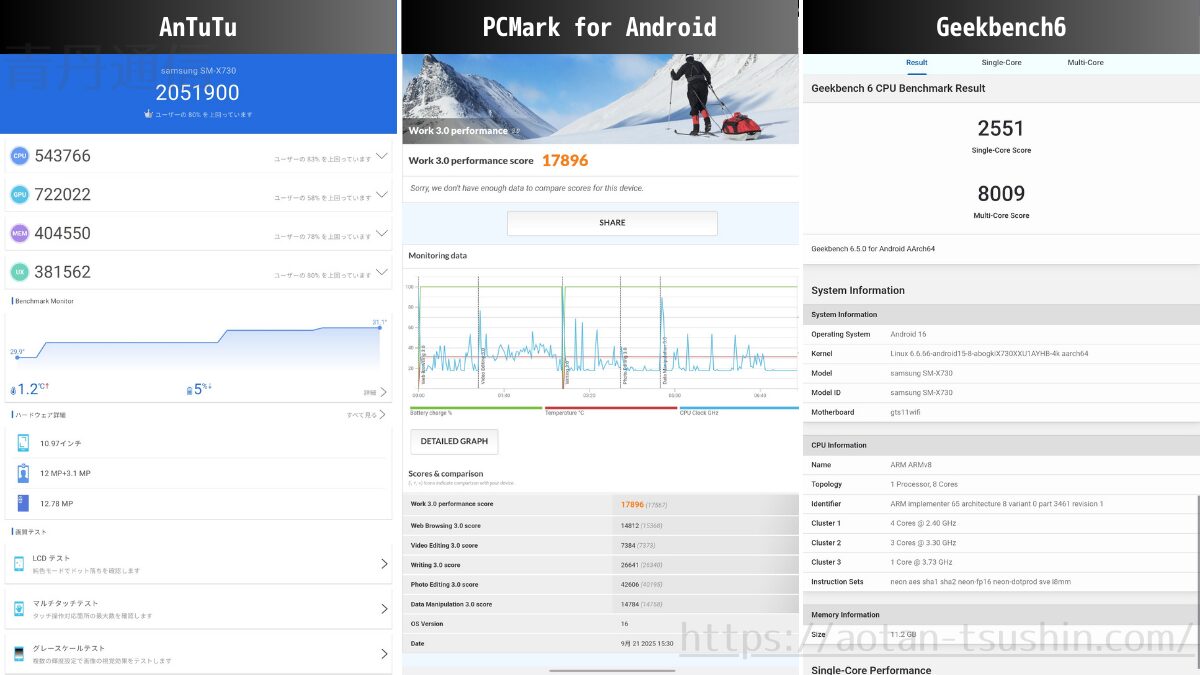 Galaxy Tab S11 | 193,416 | 4045.7MB/s | 3070.7MB/s | 1216.0MB/s 1056.0MB/s |