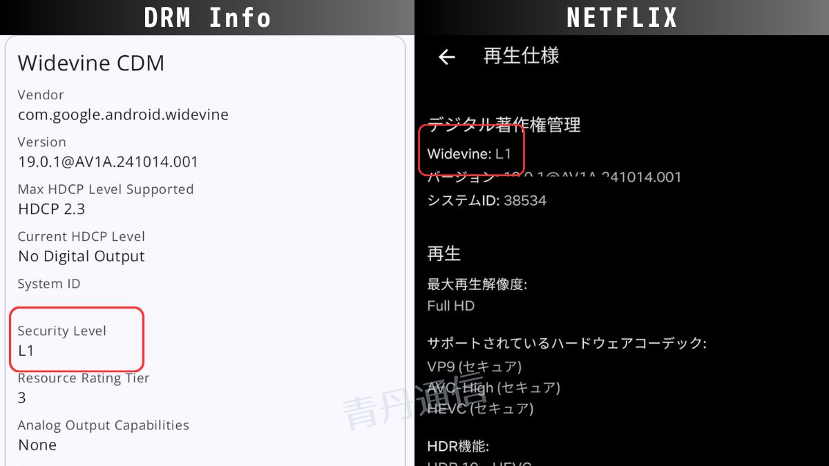 DRM InfoのSecurity LevelがL1、Netflixのデジタル著作権管理画面でもWidevine L1となっています。