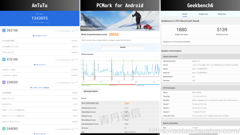 Xiaomi Pad 7は、Snapdragon 7+ Gen 3を搭載したことにより、上位機種に迫る高い処理性能を持ちながら、価格を抑えた非常にバランスの良い1台です。