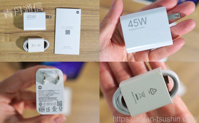 同梱されている充電器の性能は45Wの専用品となっており、非常に速い充電ができるようになっています。