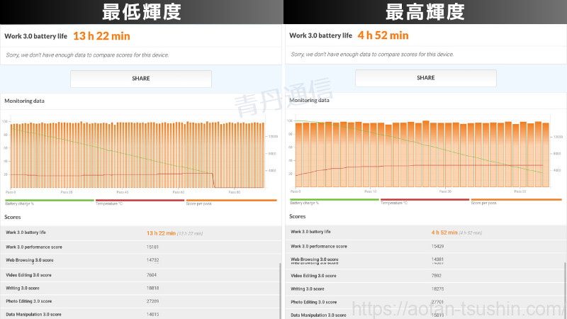 バッテリー性能最低輝度 13時間22分