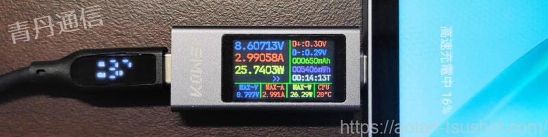 非常に地味ですが汎用の充電器で充電を試しましたが26Wという充電速度を記録していました。